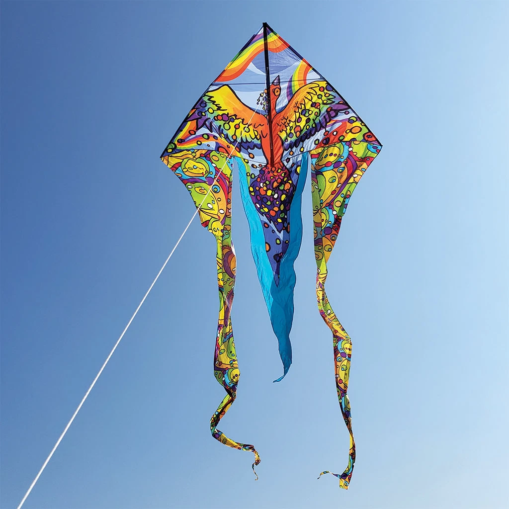 The Flo-Tail design gives you all the superb light wind capability of a regular delta combined with rock steady stability in higher winds due to their long flowing tails. The tails are sewn from a special super-soft fabric that looks like flowing water when it connects with the wind. With their long and impressive waving action, these beautiful kites can be seen for miles.