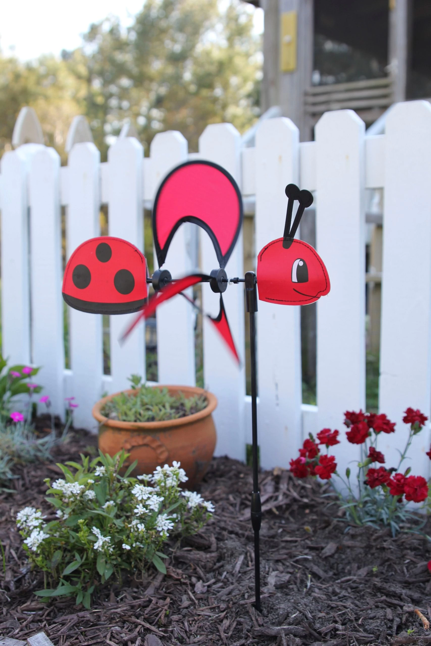 These spinners are adorable! Their small size and price are an easy fit for any garden and any pocketbook. The Petite Spinners come in a compact package and are simple to assemble and display. The wings are pre-glued so you won’t be picking up pieces after a big wind. Made from durable polyester fabric.
